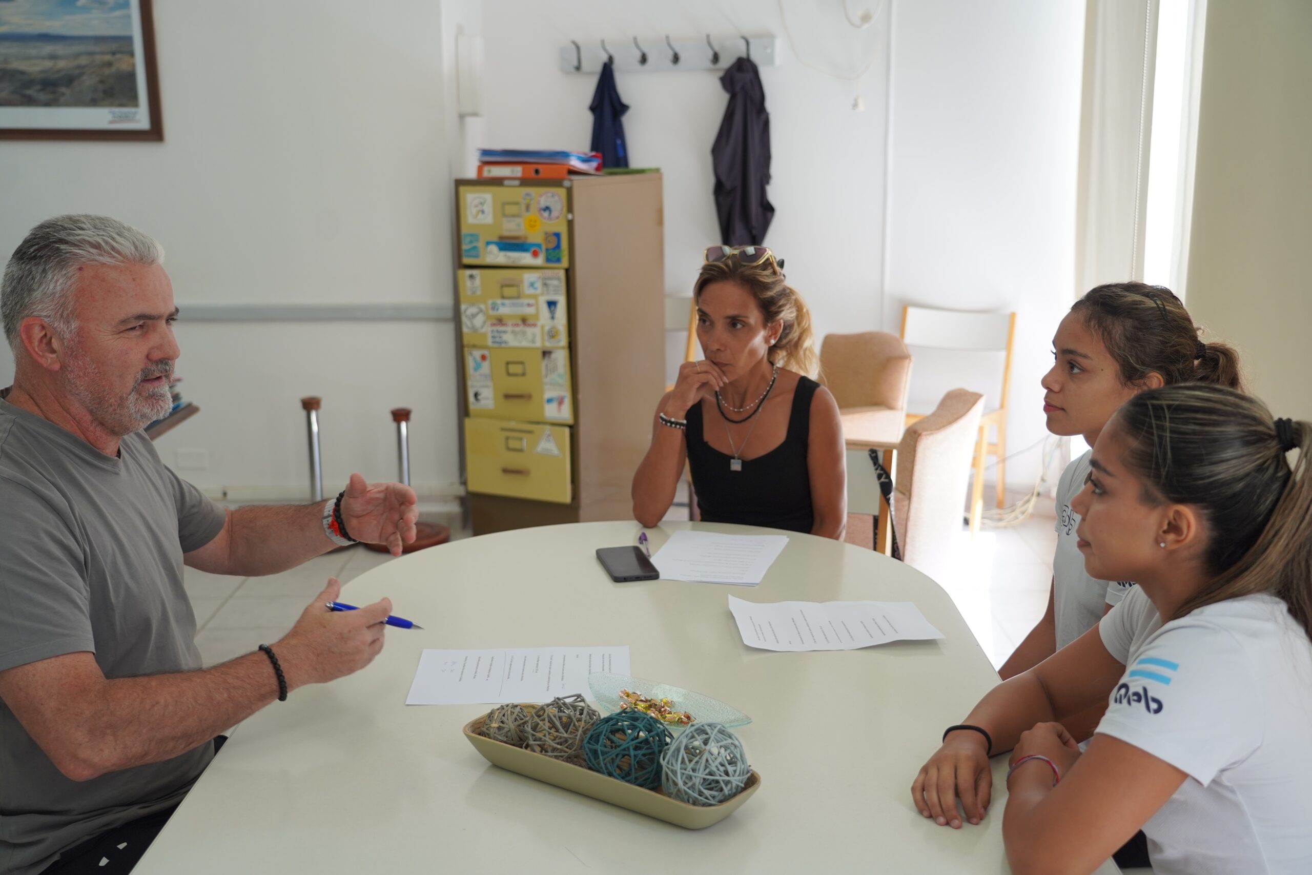 Las gimnastas, junto a su madre María Laura Vargas, se reunieron con el presidente de Comodoro Deportes, Hernán Martínez, quien les ratificó el acompañamiento para la planificación anual.