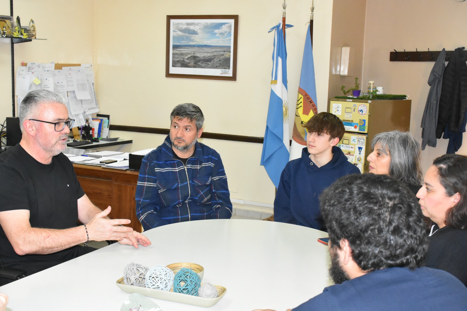 Bautista Soria, junto a su entrenador Federico Lastra, familiares e integrantes de la comisión de padres del equipo Municipal de Comodoro Rivadavia, visitaron al presidente de Comodoro Deportes, Hernán Martínez, para planificar la preparación y el viaje a Bolivia.
