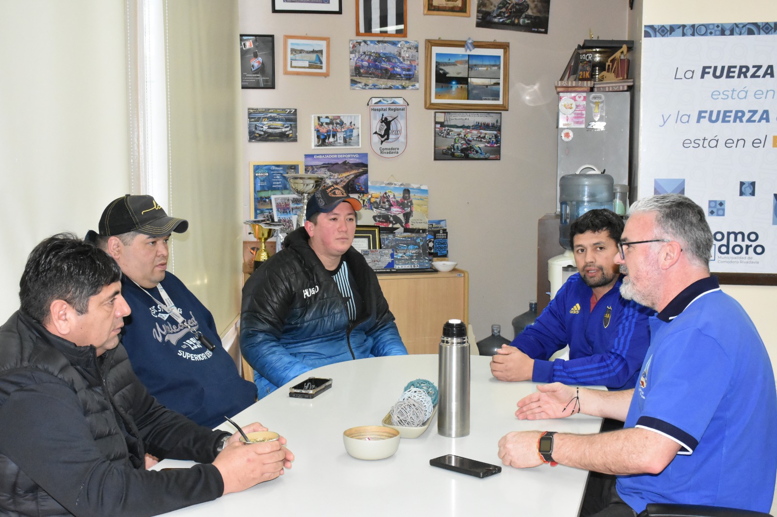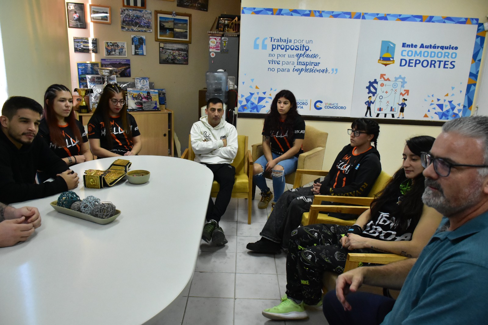 Las kickboxers, junto a Alejandro Mellado (Team Mellado), participaron de la visita de Cristian Bosch (Dojo Serpiente) al presidente de Comodoro Deportes, Hernán Martínez. Bosch estuvo acompañado por Florencia Greco, Pablo Emérito y Tomás “Chacal” Aguirre.