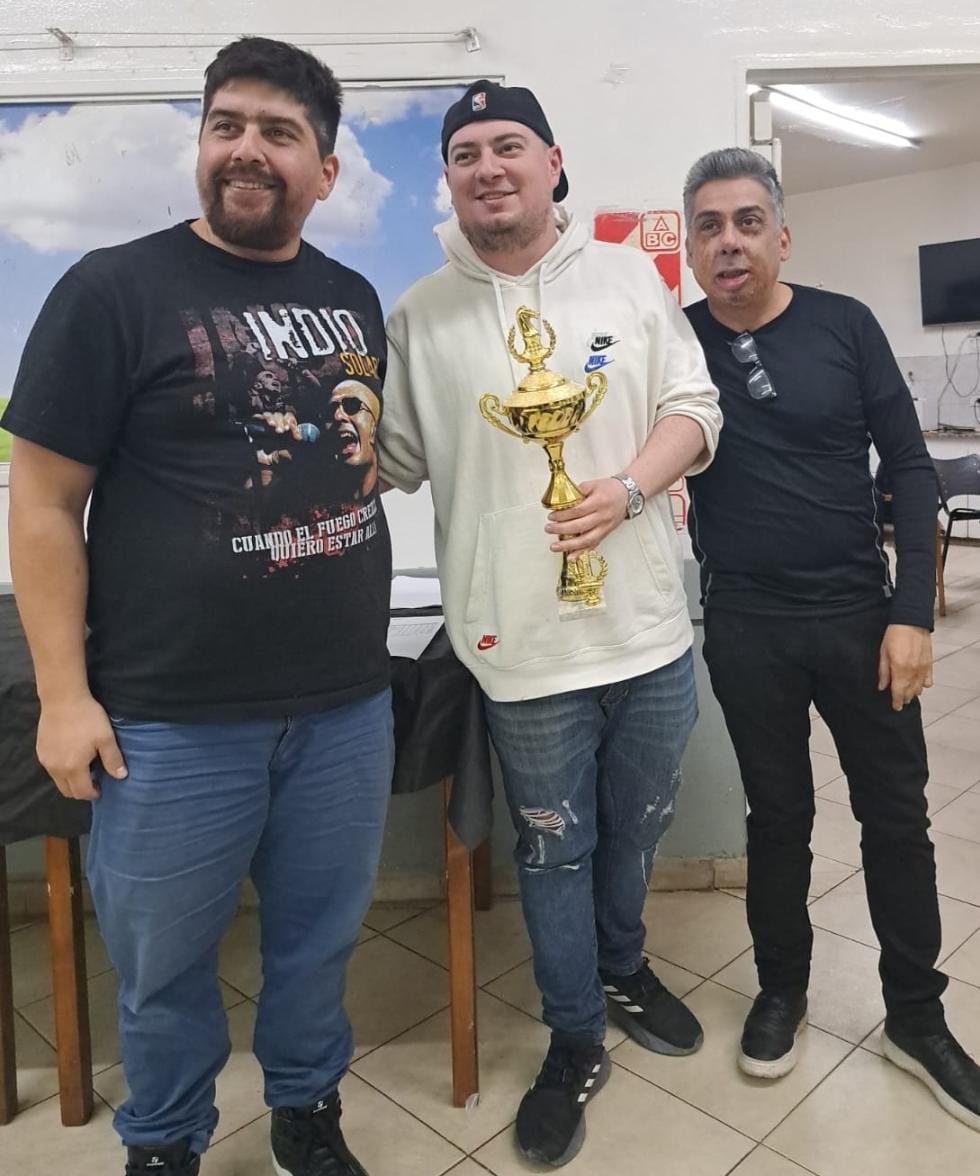 Lucas Rivas -presidente del club organizador-, el campeón de primera categoría Maximiliano Aguinaga y el árbitro Juan Carlos Mendoza.